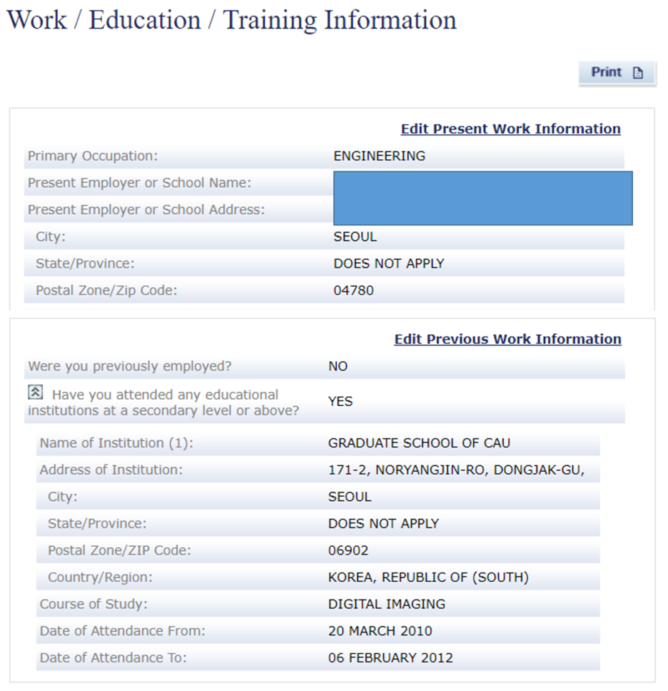 당신이 당신의 신청서에 제공한 정보와 당신의 신청서와 함께 제출된 다른 정보는 법 집행과 이민법 집행 목적을 포함하여 그러한 정보를 사용할 법적 또는 다른 법적 권한을 가진 다른 정부 기관이 접근할 수 있다. 지문이 신청 과정의 일부로 수집되는 경우, 지문을 FBI의 차세대 식별(NGI) 지문 시스템이나 그 후계 시스템(민간, 범죄 및 잠복 지문 보관소 포함)의 다른 지문과 비교할 목적으로 사용할 수 있다. FBI의 CJIS Division Records System에 나타나는 레코드를 수정하려면 제목 28, CFR, 섹션 16.34에 명시된 레코드를 변경, 수정 또는 업데이트하는 절차를 따라야 한다. 당신이 당신의 신청서와 함께 제공한 사진은 고용 확인이나 다른 미국 법률 목적에 사용될 수 있다.