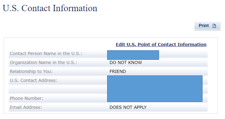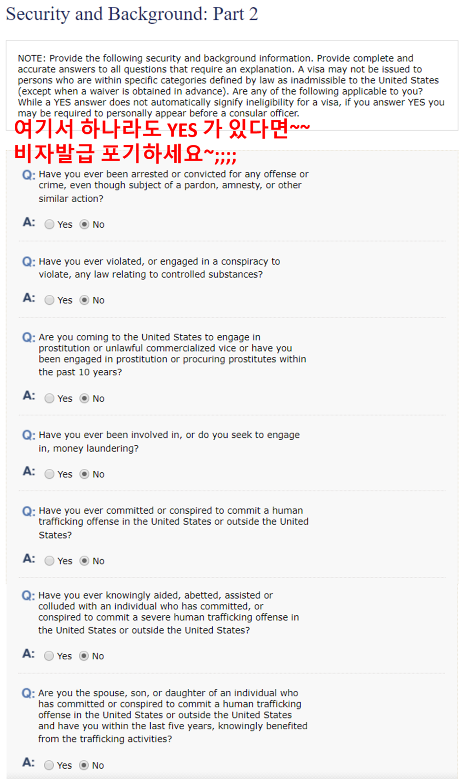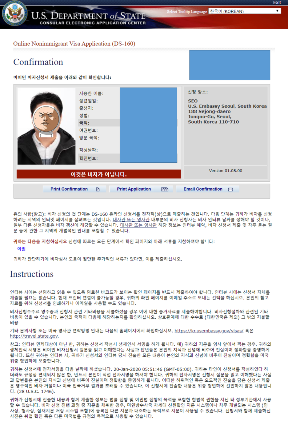 또한, "신청서 서명 및 제출"을 클릭하면 미국 입국을 신청하는 항구의 미국 출입국 관리에게 비자를 제출해야 하며, 입국 시 비자를 소지하면 미국에 입국할 수 있는 자격이 없다는 것을 이해한다는 것을 증명할 수 있다. 미국 이민법에 따라 수용 불가 귀하는 신청서 내에서 귀하가 작성한 중대한 사실에 대한 고의적으로 허위 또는 오해의 소지가 있는 진술이나 고의적인 은폐가 귀하를 미국으로부터 영구적으로 제외시킬 수 있으며, 귀하가 미국에 입회할 경우 형사 기소 및/또는 추방의 대상이 될 수 있음을 이해한다는 것을 증명하고 있다.
