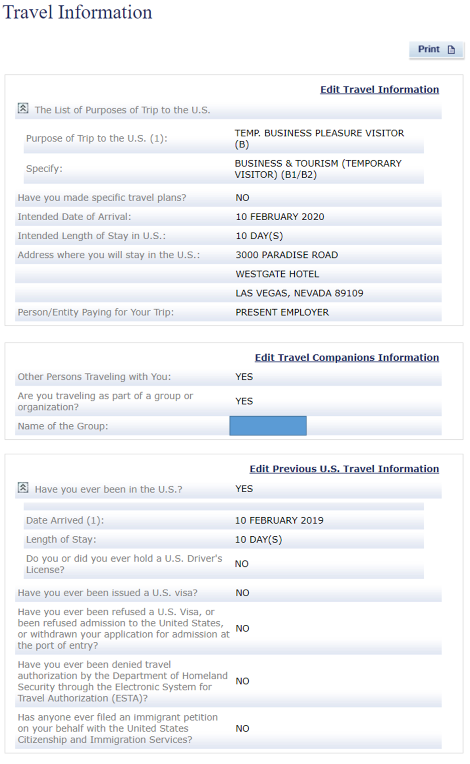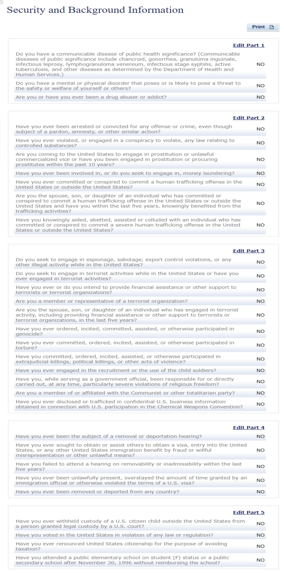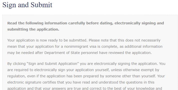By clicking “Sign and Submit Application” you are electronically signing the application. You are required to electronically sign your application yourself, unless otherwise exempt by regulation, even if the application has been prepared by someone other than yourself. Your electronic signature certifies that you have read and understood the questions in this application and that your answers are true and correct to the best of your knowledge and belief. The submission of an application containing any false or misleading statements may result in the permanent refusal of a visa or the denial of entry into the United States. All declarations made in this application are unsworn declarations made under penalty of perjury. (28 U.S.C. 1746).