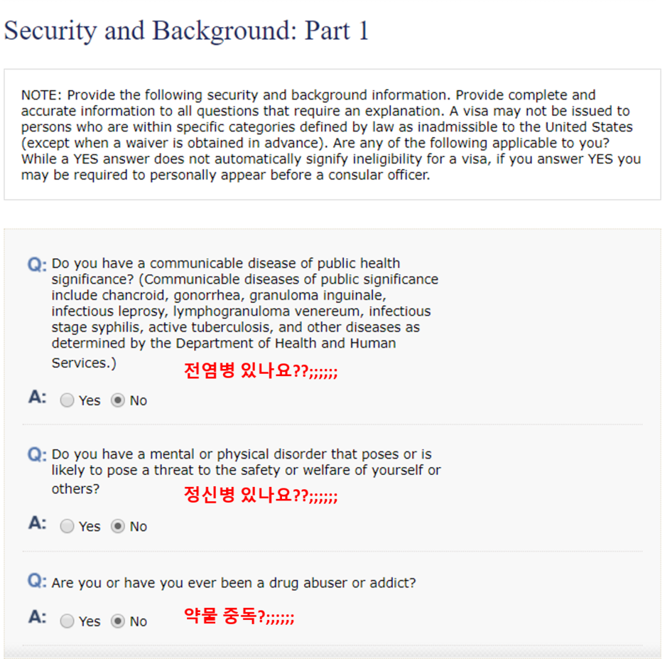 일부 비자 신청자는 INA 섹션 212(a) 및 221(d)에 부합하는 비자 자격을 평가하기 위해 인가된 의사와 함께 건강 진단을 받아야 하며, 요구 사항을 통보받게 된다. 만약 당신이 통보를 받고 건강 진단을 받아야 한다면, 필요한 정보를 제공하지 않으면 비자 신청이 지연되거나 거절될 수 있다. 건강검진을 받아야 할 경우, 당신의 건강검진 정보를 수집하여 호주 내무부에서 호스팅, 운영 및 유지관리하는 eMedical 시스템에 일시적으로 저장할 수 있다. 만약 당신의 건강검진이 eMedical에서 수집된다면, 당신은 미국 국무부가 당신의 의료적 자격을 결정할 수 있도록 그리고 미국 질병통제예방센터의 승인을 받아야 할 것이다.공중보건서비스법 제325조 및 INA조 212(a)에 따라 공중보건 기능을 수행한다.