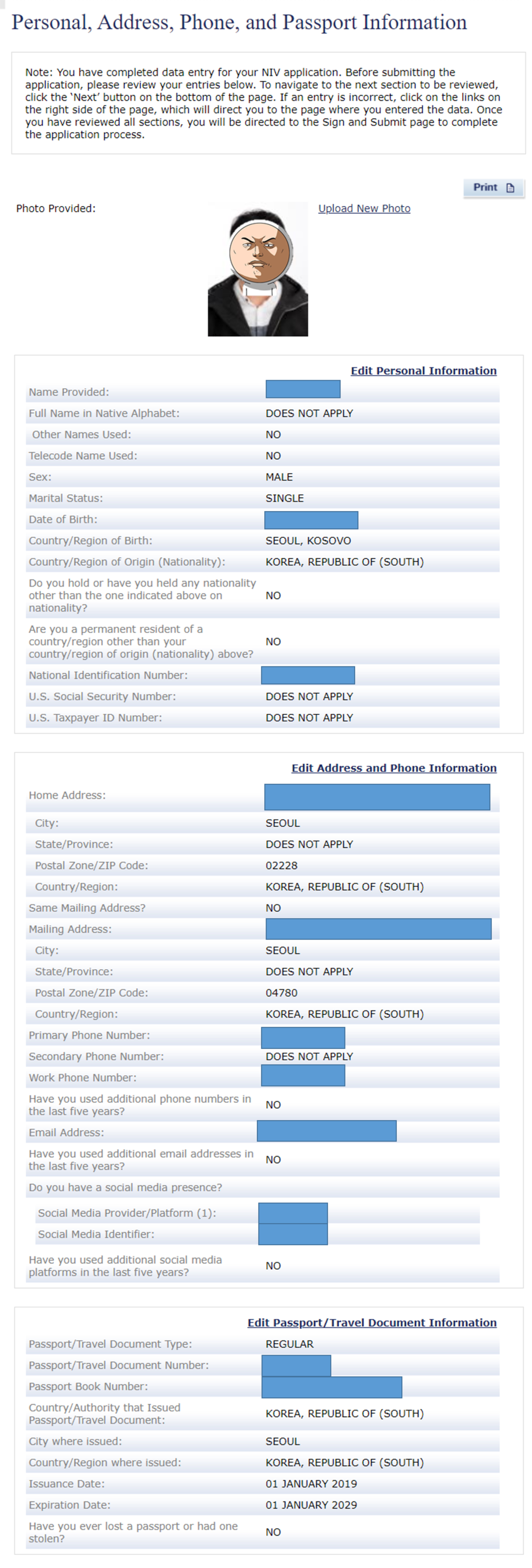 "신청서 서명 및 제출"을 클릭하면 신청서에 전자적으로 서명할 수 있다. 신청서가 본인 이외의 다른 사람이 작성했더라도, 규정에 의해 별도로 면제되지 않는 한, 당신은 스스로 전자적으로 신청서에 서명해야 한다. 당신의 전자서명은 당신이 이 신청서의 질문들을 읽고 이해했다는 것과 당신의 답이 당신의 지식과 신념에 가장 맞는 진실하고 정확하다는 것을 증명한다. 허위 또는 오해의 소지가 있는 진술을 포함하는 신청서의 제출은 비자의 영구적 거부나 미국 입국 거부를 초래할 수 있다. 이 신청서에서 한 모든 선언은 위증의 벌칙에 따라 행해진 진부하지 않은 선언이다. (28 U.S.C. 1746년)